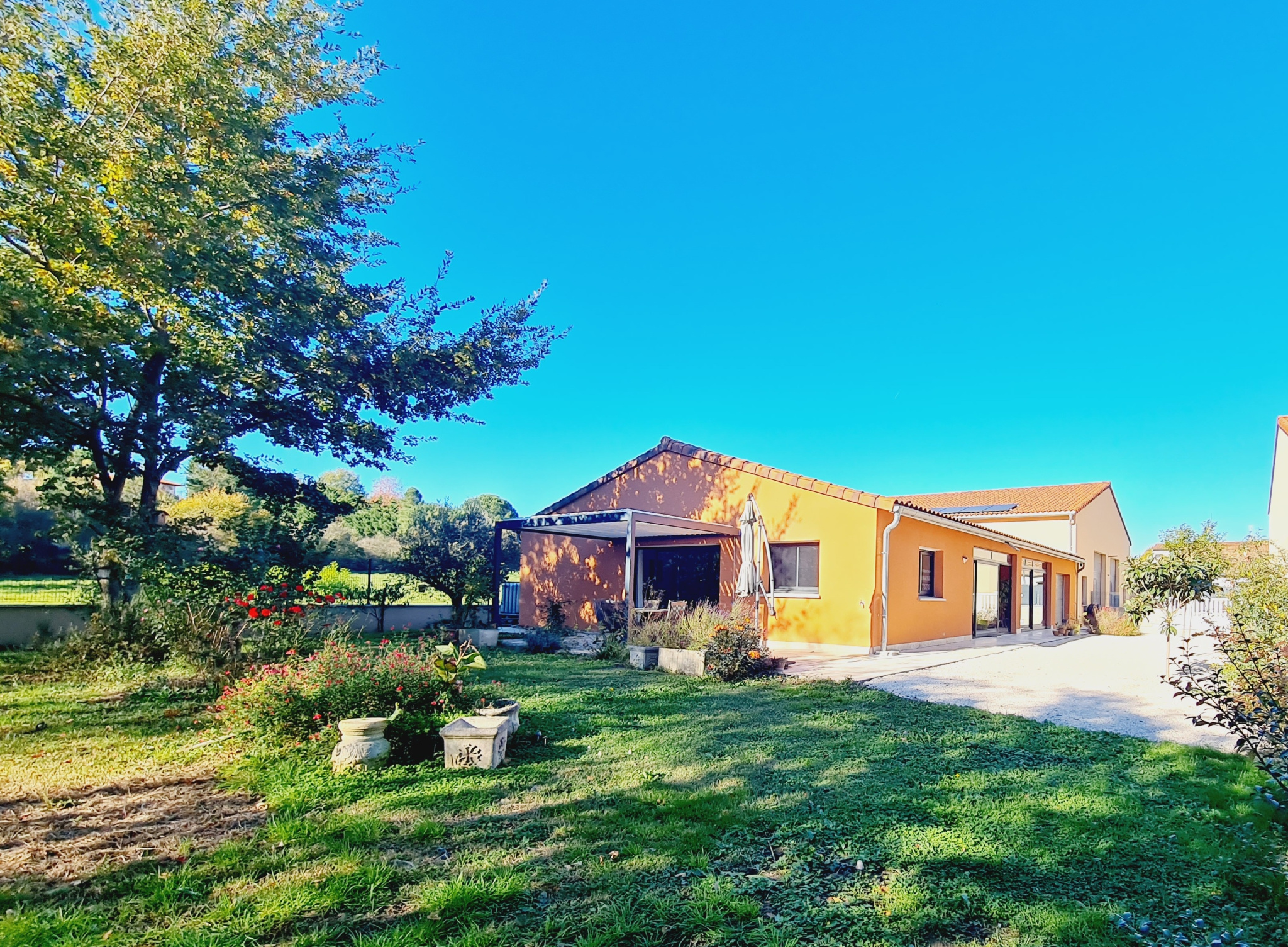OPPORTUNITÉ À 35 KM SUD TOULOUSE 6KM A64 Saint-Sulpice-sur-Lèze Centre village venez découvrir cette VILLA de plain-pied de130M² avec garage ET DEUX HANGARS DE 130M² CHACUN SUR UN TERRAIN de 1200m² sans vis-à-vis et à proximité immédiate de toutes les commodités boulangerie, pharmacie, école, commerces).Les deux hangars de 130m² chacun pouvant être loué indépendamment de la maison un portail sépare l'ensemble du bien. Situé en zone artisanal elle peut convenir à plusieurs professions ou personnes voulant uniquement louer les hangars et garder l'habitation. La villa est composée d'un espace véranda suivie d'une entrée équipée de grand placards donnant sur une belle pièce de vie traversante et lumineuse ouverte sur une cuisine entièrement équipée avec accès direct sur la terrasse avec pergolas et volet électrique et le jardin. Le coin nuit dispose de trois chambres dont une suite parentale équipée d'un dressing et d'une salle de douche moderne avec vasque et douche italienne& wc. Les deux autres chambres sont équipées de placard, d'u toilette indépendant, d'une autre salle d'eau moderne avec vasque et douche à l'italienne. Une pièce de 12m² avec une porte donnant sur l'extérieur actuellement cellier / buanderie stockage pouvant être transformé en chambre et enfin un garage de 28m². Conforme à la norme RT2012 et équipée de panneaux photo-voltaïques, aucun problèm< b>e< /b>< /i>.">aucun travaux à prévoir. L'ensemble de la maison est reliée au tout à l'égout, double vitrage, volets & portail électrique, chauffage pompe à chaleur, cumulus thermodynamique.l''emsemble sur 1200mterrain clôturé et arboré les deux hangars de 130m² chacun, pourraient-êtres relier ensemble par une ouverture prévue à cet effet ; Chaque bâtiment à ses propres murs et les hangars sont pourvus de porte électrique, d'électricité et d'un point d'eau.REF 53008 Prix 575 000€Frais d'agence inclus soit 4%.5 D'honoraire charge acquéreur taxe foncière, il est de 1 100 €/an. Classement énergétique : A entre 408 € et525 € Prix moyens des énergies indexés au 1er janvier 2021 (abonnements compris) GES :A 1 .Pour tout renseignement, contact Agence Adèsimmo sur le secteur Noé, Lézat sur Lèze, Capens, Carbonne, Beaumont, Mauzac... au 05 61 87 20 00 et à contact@adesimmo.com